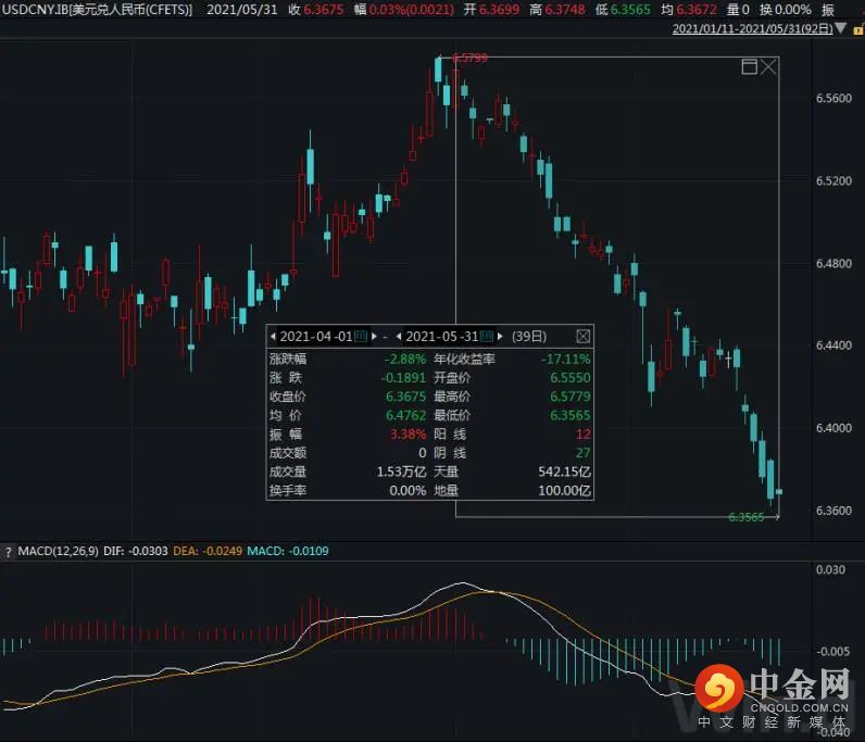 自消息发布后,离、在岸人民币双双下挫。在岸人民币报6.3675,离岸人民币兑美元报6.3665。从在岸美元兑人民币走势上看,自4月份开始,美元兑人民币一路贬值,即人民币一路升值达2.88%,幅度较大。