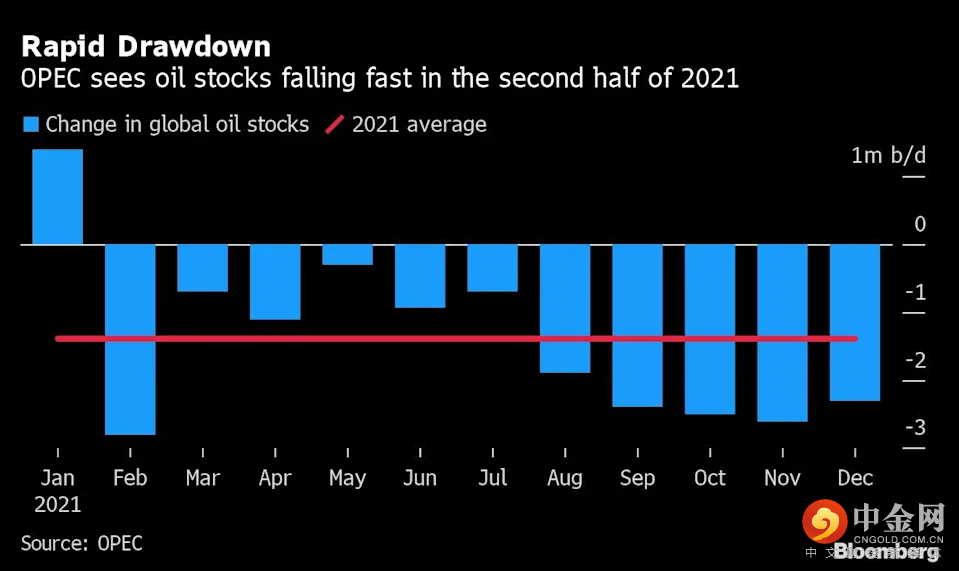 而欧佩克给出的预计中,今年接下来时间段原油的库存将会快速消耗,每个月库存都将出现负增长,映衬出原油供不应求的局面。到7月底,发达国家的库存将低于2015-2019年的平均水平,从9月到12月,库存将以每天超过200万桶的速度迅速减少。