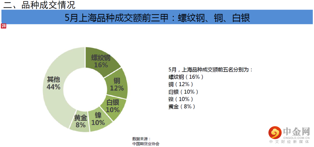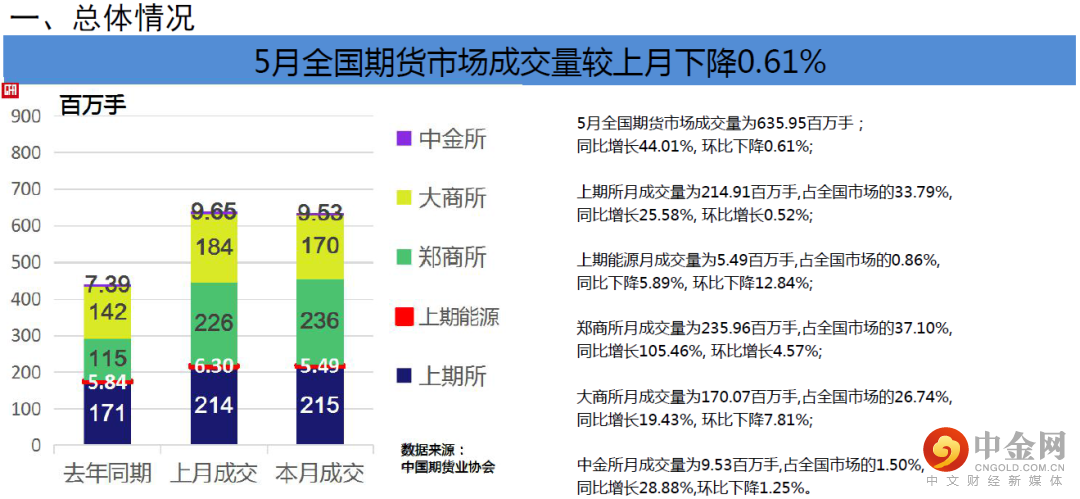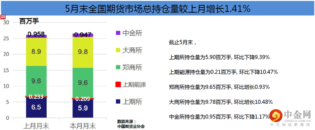上海期货交易所5月成交量为214,908,235手,成交额为180,823.59亿元,分别占全国市场的33.79%和36.30%,同比分别增长25.58%和99.69%,环比分别增长0.52%和7.55%。5月末上海期货交易所持仓总量为5,904,384手,较上月末下降9.39%。1-5月上海期货交易所累计成交量为1,040,875,507手,累计成交额为849,862.29亿元,同比分别增长38.45%和118.38%,分别占全国市场的33.31%和35.51%。
