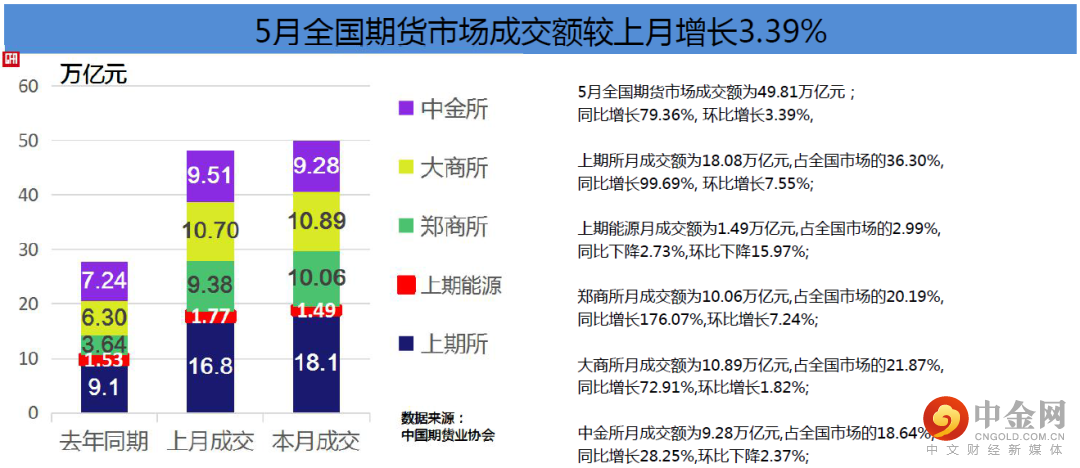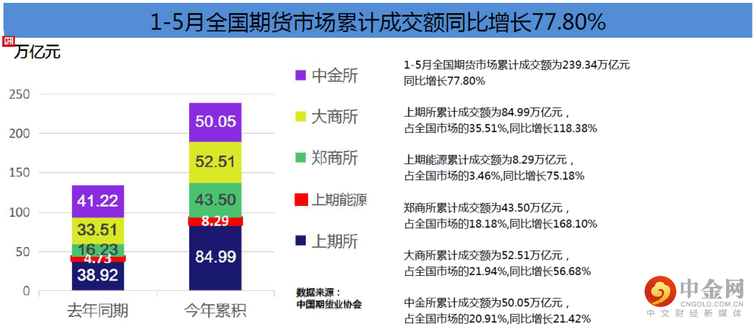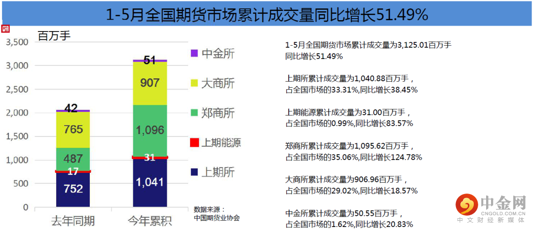 中国期货业协会最新统计资料表明,以单边计算,5月全国期货市场成交量为635,954,908手,成交额为498,084.41亿元,同比分别增长44.01%和79.36%,环比分别下降0.61%和增长3.39%。1-5月全国期货市场累计成交量为3,125,011,383手,累计成交额为2,393,408.76亿元,同比分别增长51.49%和77.80%。