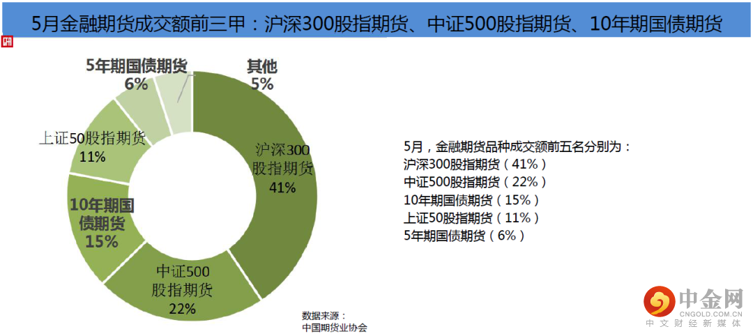 中国金融期货交易所5月成交量为9,525,635手,成交额为92,826.45亿元,分别占全国市场的1.50%和18.64%,同比分别增长28.88%和28.25%,环比分别下降1.25%和2.37%。5月末中国金融期货交易所持仓总量为947,230手,较上月末下降1.17%。1-5月中国金融期货交易所累计成交量为50,551,683手,累计成交额为500,492.94亿元,同比分别增长20.83%和21.42%,分别占全国市场的1.62%和20.91%。