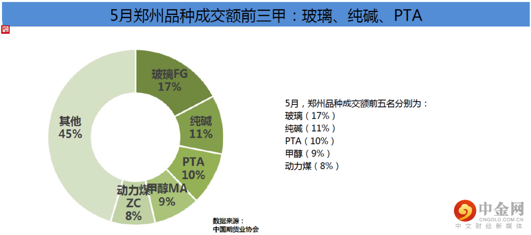 郑州商品交易所5月成交量为235,963,512手,成交额为100,586.92亿元,分别占全国市场的37.10%和20.19%,同比分别增长105.46%和176.07%,环比分别增长4.57%和7.24%。5月末郑州商品交易所持仓总量为9,649,736手,较上月末增长0.93%。1-5月郑州商品交易所累计成交量为1,095,622,168手,累计成交额为435,046.97亿元,同比分别增长124.78%和168.10%,分别占全国市场的35.06%和18.18%。