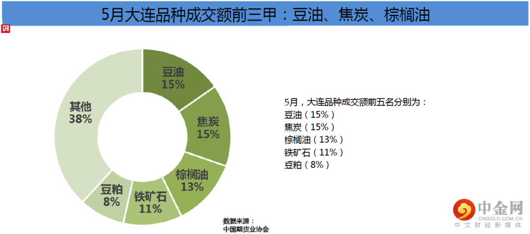 大连商品交易所5月成交量为170,065,246手,成交额为108,938.53亿元,分别占全国市场的26.74%和21.87%,同比分别增长19.43%和72.91%,环比分别下降7.81%和增长1.82%。5月末大连商品交易所持仓总量为9,779,069手,较上月末增长10.48%。1-5月大连商品交易所累计成交量为906,959,069手,累计成交额为525,098.60亿元,同比分别增长18.57%和56.68%,分别占全国市场的29.02%和21.94%。