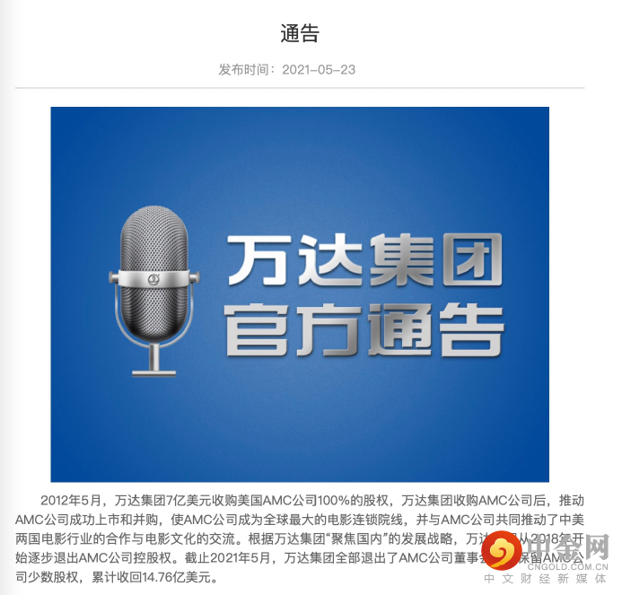 今年5月23日,万达集团在官网上公告称,截止2021年5月,万达集团全部退出了AMC公司董事会,仅保留AMC公司少数股权,累计收回14.76亿美元。(约合94亿人民币)