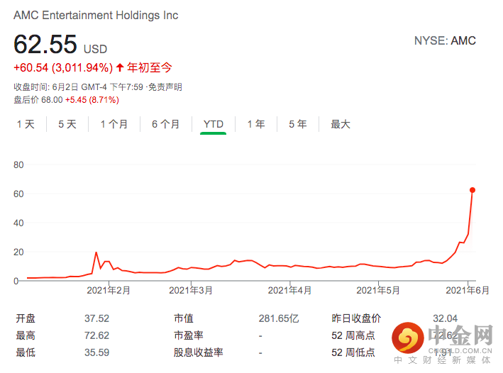 周三,AMC盘中几次触发熔断,至收盘股价几近翻倍,站上60美元,使之市值达到281亿美元,超过标普500指数近一半成分股。短短几个月时间,AMC市值从不到5亿的小盘股荣升大盘,年内涨幅盘中一度超过3000%,成为30倍股。