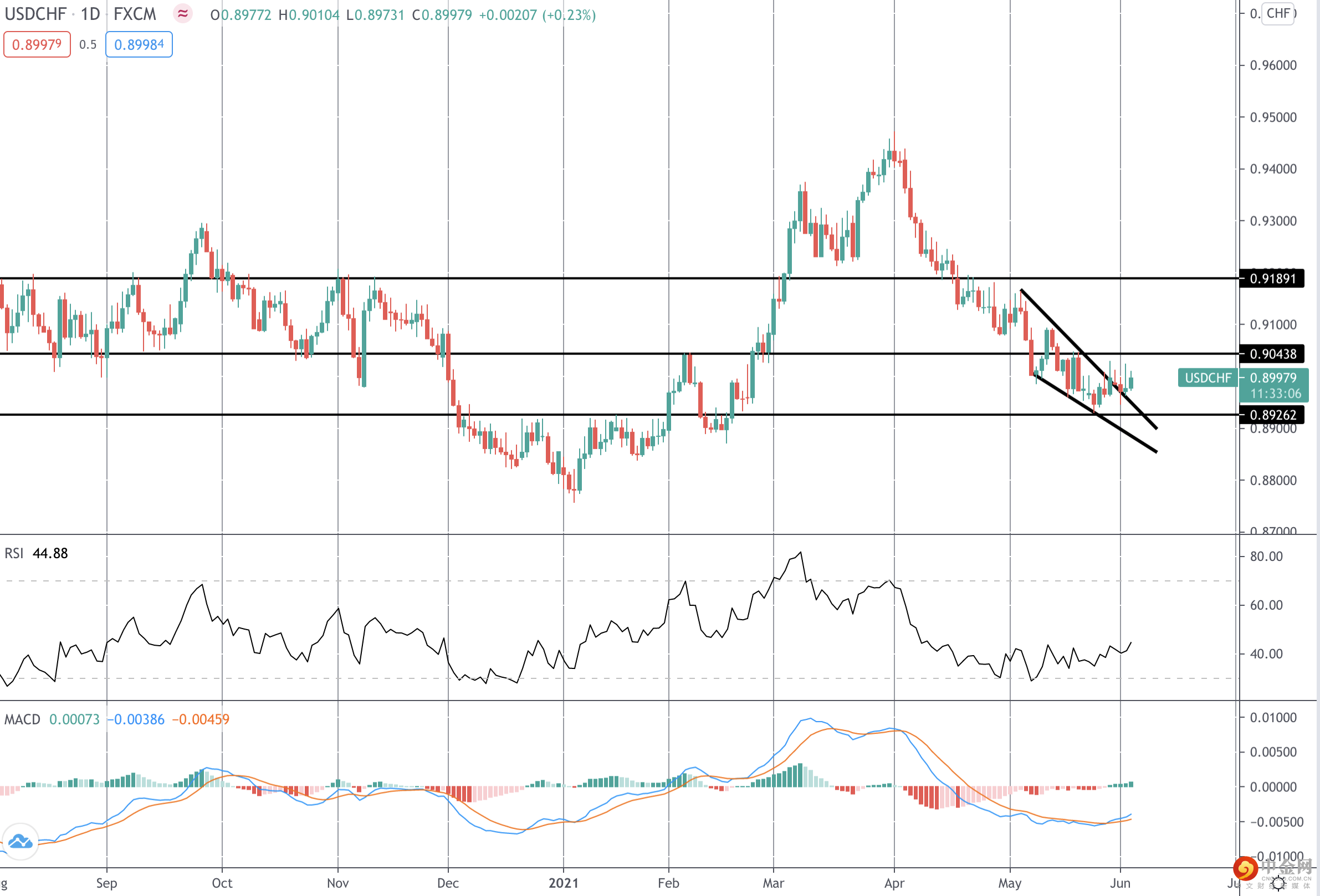 自第一季度高点以来,美元兑瑞郎一直在稳步下跌。然而,随着价格测试 0.8926 水平,最近的走低已经看到大量看涨背离出现,这表明市场已准备好反转。我们已经看到了局部下降楔形模式的突破,尽管还没有跟进。如果今天的数据不错,价格应该会突破 0.9043 的水平,多头首先瞄准 0.9181。如果数据疲软,美元可能会继续走低。