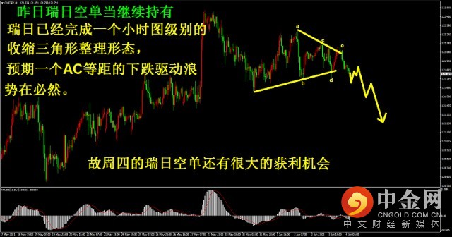 昨日瑞日空单当继续持有,瑞日已经完成一个小时图级别的收缩三角形整理形态,预期一个AC等距的下跌驱动浪势在必然。故周四的瑞日空单还有很大的获利机会。