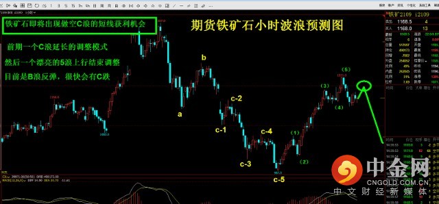 期货铁矿石小时波浪预测图。铁矿石即将出现做空C浪的短线获利机会。前期一个C浪延长的调整模式,然后是一个漂亮的5浪上行结束调整,目前是B浪反弹,很快会有C跌。