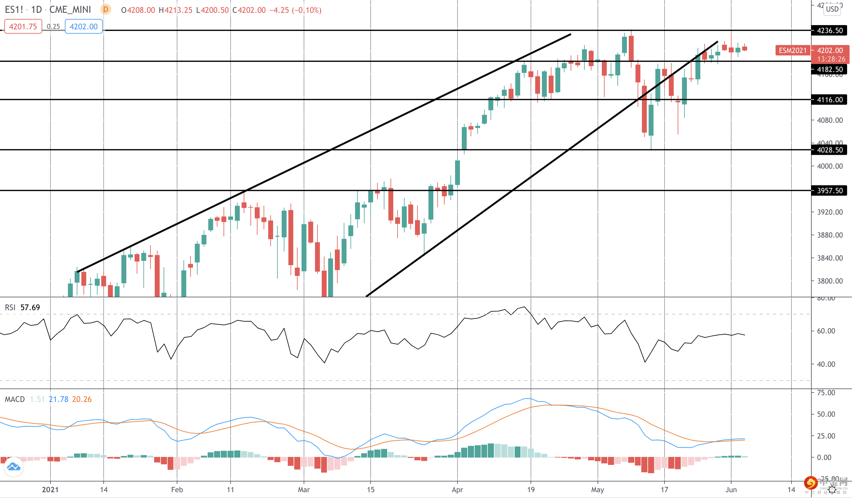 在明天的数据公布之前,股市在高点附近盘整。如果美元走高,股市可能会大幅跌破 4182.50 水平。鉴于 MACD 和 RSI 均出现看跌背离,此举可能很快会测试 4116 水平。或者,如果美元下跌,我们可能会看到突破 4236.50 水平。