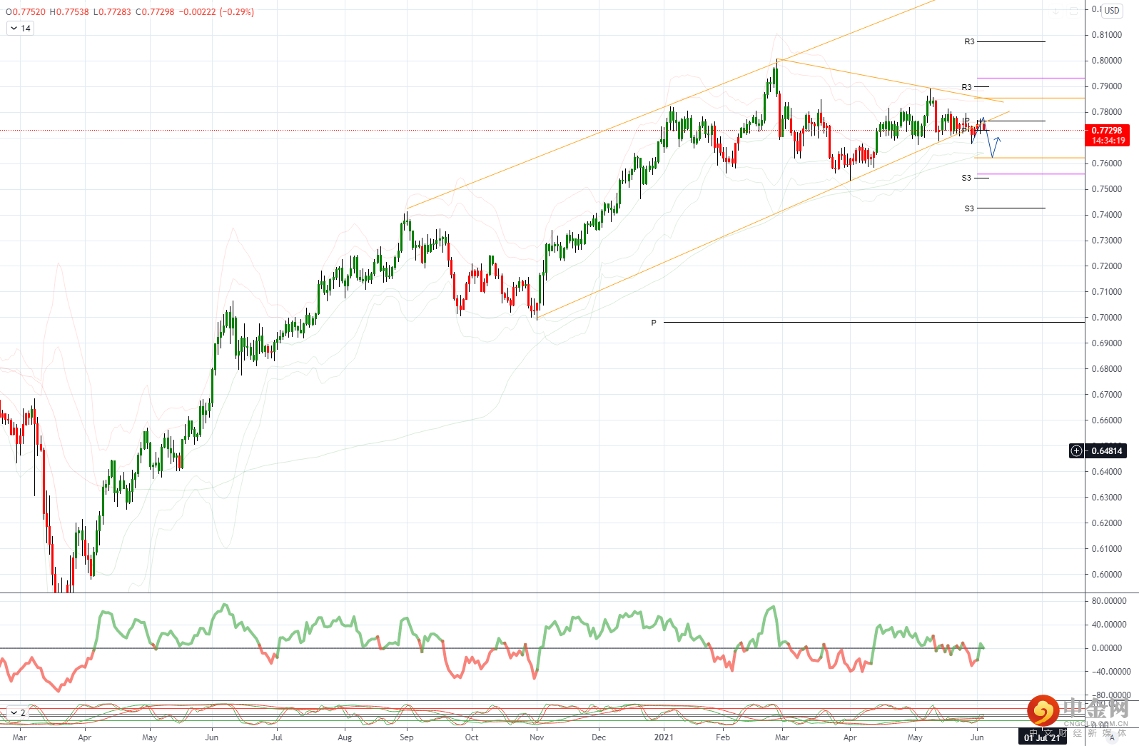 AUDUSD 从技术角度来看,突破 0.7790 重新聚焦下行,因为 .7820 包含上行尝试,期待测试 0.7680。