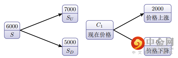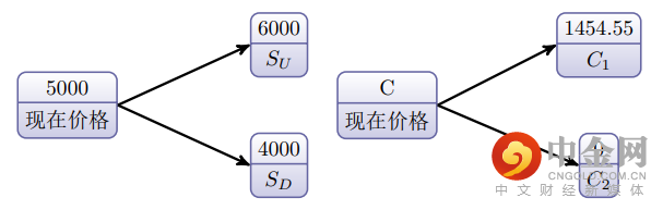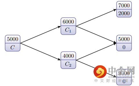 利用公式求 C1、C2、C。在给定的条件中,SU=7000,SD=5000,CU=2000, CD=0,r=0.1,带入公式得 C1 = 1454.55。虽然 C2 也可以用如上公式求得,但从下图可以看到,C2 在到期时不管标的资产上涨或下跌,期权价值均为 0。