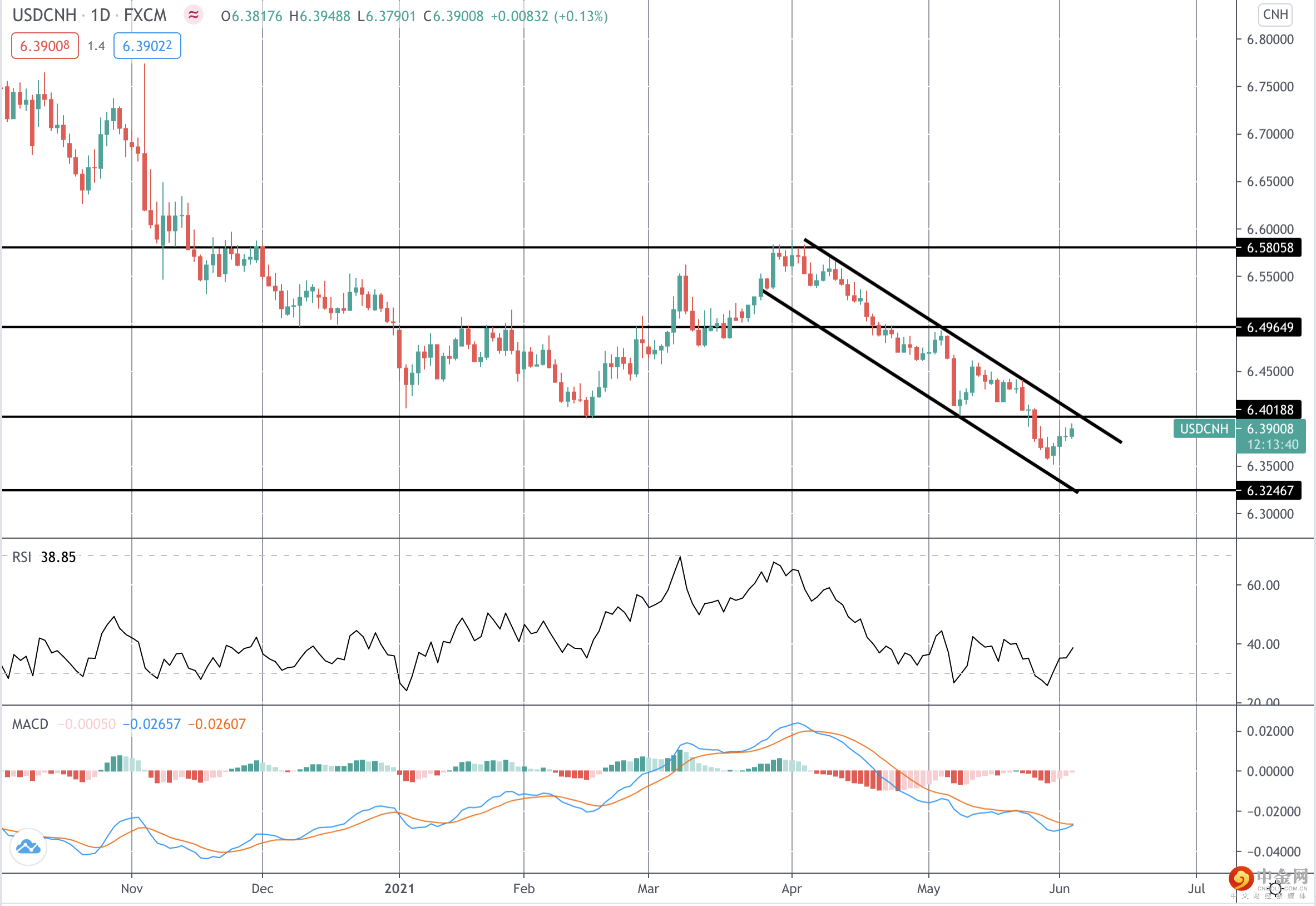 由于熊市通道继续延伸,今年美元兑离岸人民币的抛售使价格跌破了 2021 年之前的低点 6.4018 水平。然而,MACD 和 RSI 背离一直在下跌的最后阶段建立,价格现在正在通道内修正走高。如果价格能够突破该水平和通道顶部,多头接下来将寻找上涨至 6.4964 的水平。