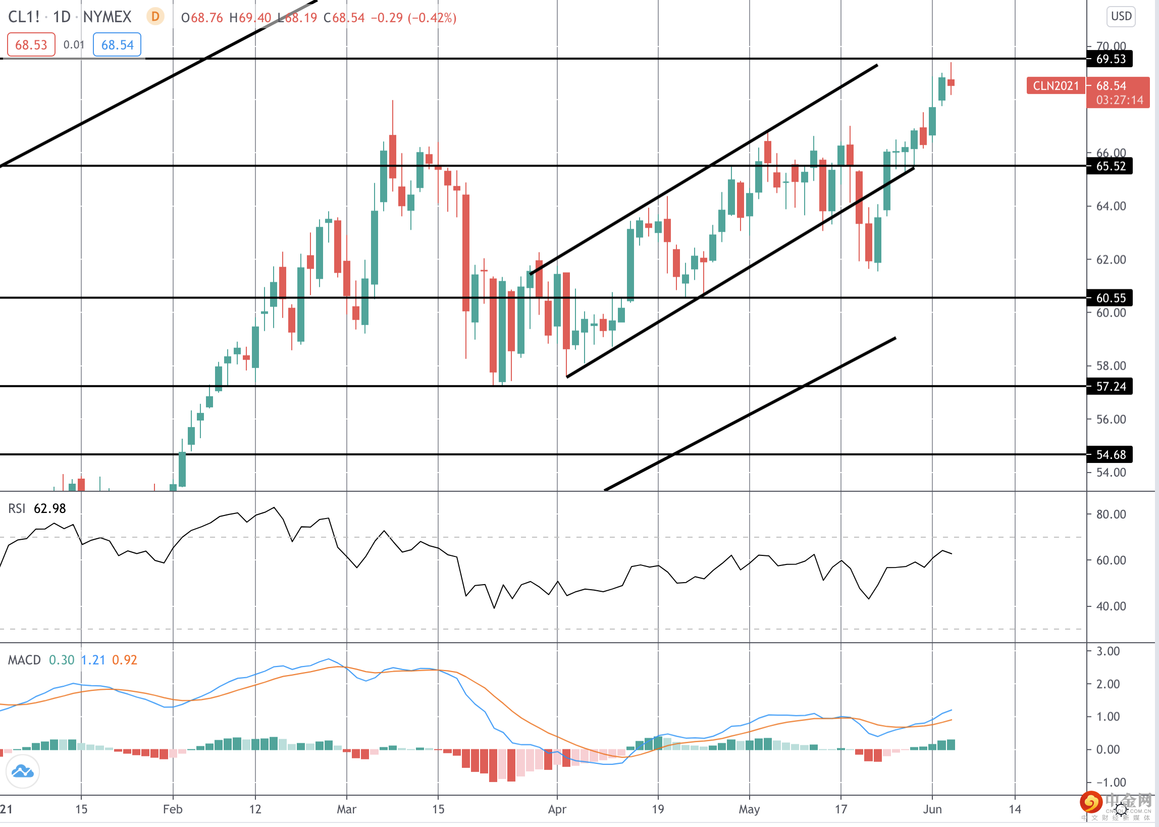 本周原油价格的上涨使市场超越了 2021 年的前高点,最高测试了 69.53 水平,卖家介入。MACD 和 RSI 指标的看跌背离表明这里需要谨慎。然而,虽然价格保持在 65.52 水平上方,但焦点仍是进一步上涨。