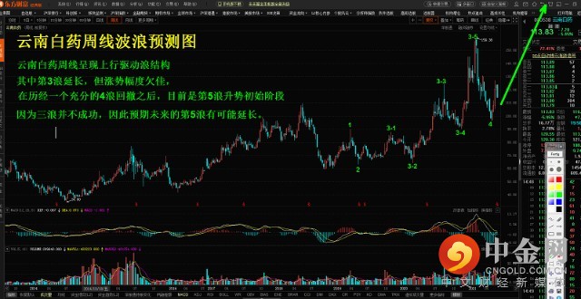 云南白药周线呈现上行驱动浪结构,其中第3浪延长,但涨势幅度欠佳,在经历一个充分的4浪回撤之后,目前是第5浪升势初始阶段,因为三浪并不成功,因此预期未来的第5浪有可能延长。