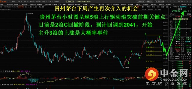 贵州茅台下周产生再次介入的机会,贵州茅台小时图呈现5浪上行驱动浪突破前期关键点,目前是2浪C回撤阶段,预计回调到2041,开始主升3浪的上涨是大概率事件。