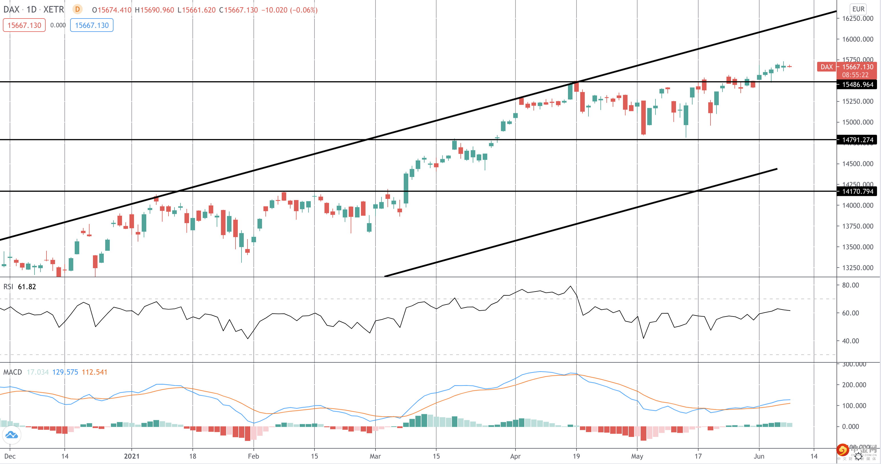 DAX 目前仍高于 15486.96 水平,在牛市通道的上端交易。虽然 MACD 和 RSI 都看涨,但两个指标的看跌背离值得注意。短期内跌破 15486.96 水平将为接下来测试 14791.27 水平开辟道路。