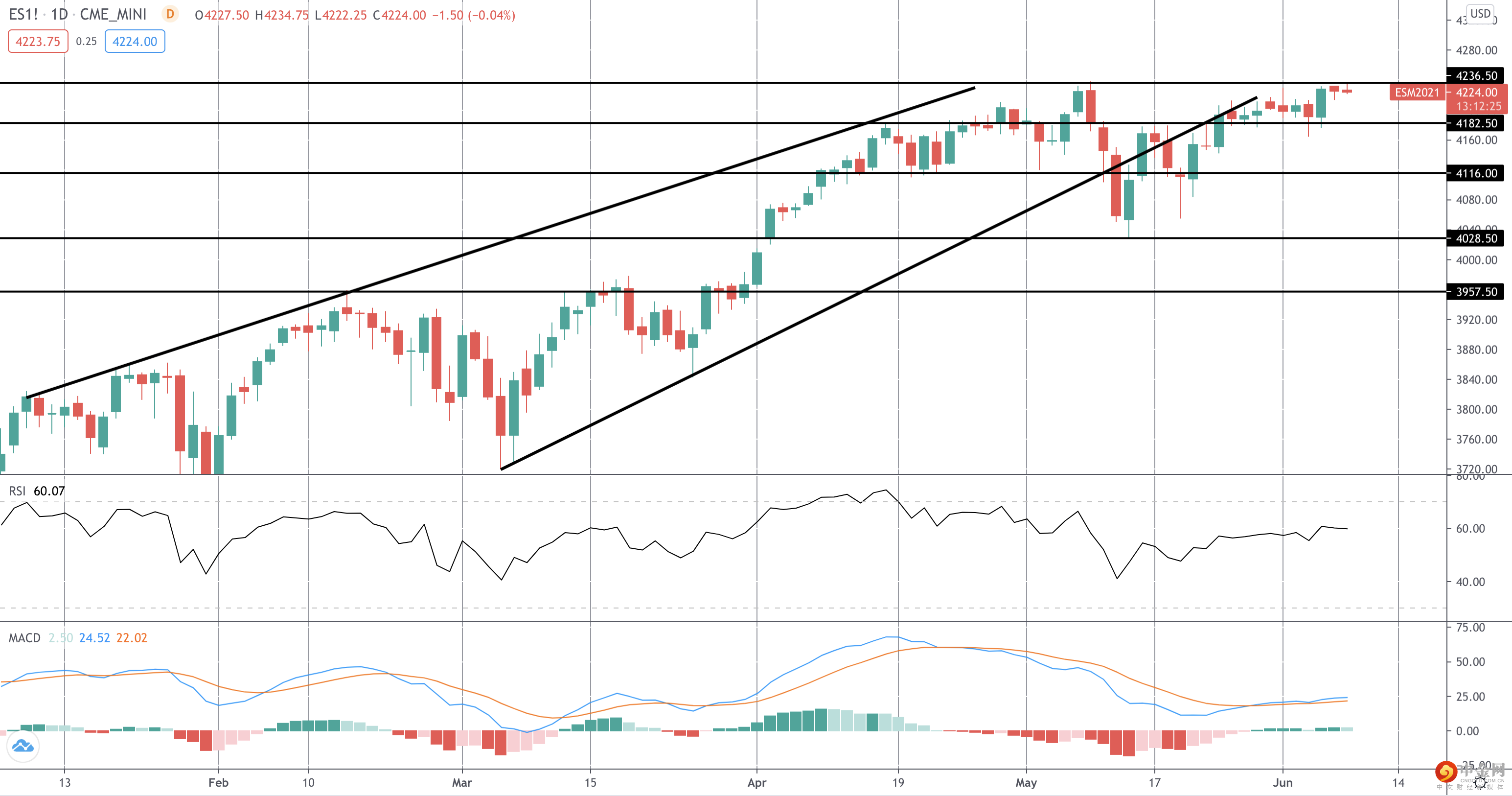标准普尔指数继续守在 4236.50 的高点附近。 MACD 在这里大致持平,RSI 也是如此,突显出市场缺乏动力。 目前,重点是进一步推高,符合长期趋势。 不过,若跌破4182.50水平,接下来焦点将转向4116水平支撑