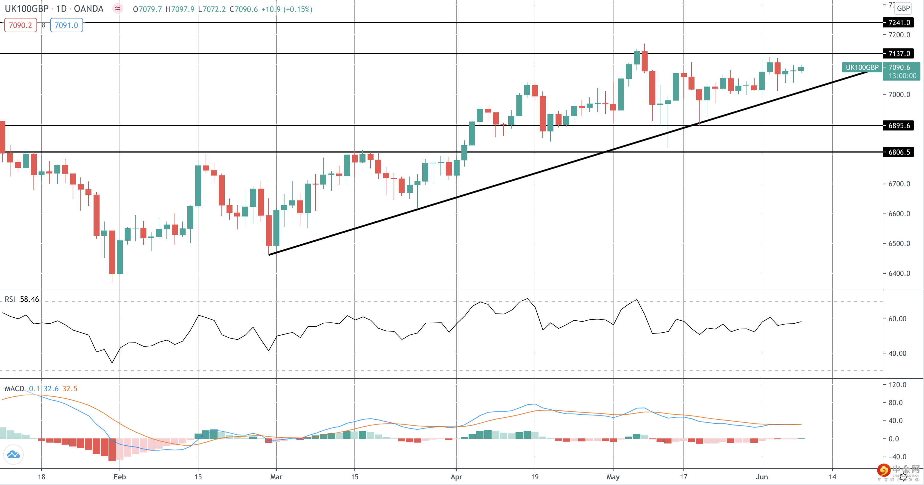 富时指数的涨势在最近几周失去了动力,价格位于 6895.6 位支撑位和 7137 位阻力位之间的区间内。 从 2021 年低点开始的上升趋势线继续支持目前的走势,使市场继续关注进一步上行。 目前 RSI 和 MACD 均持平,表明一旦突破,两个方向都有足够的扩张空间。