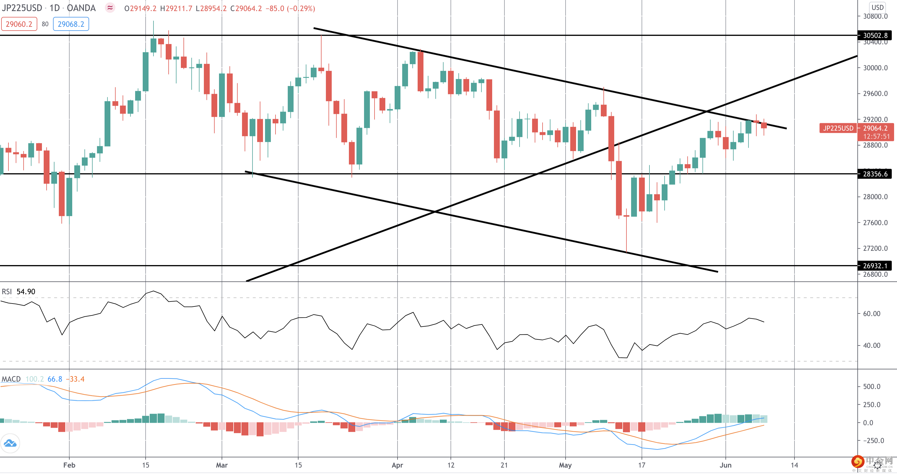最近几周日经指数的反弹已经看到价格上涨以测试熊市通道顶部,该通道目前作为阻力位。 MACD 和 RSI 均看涨,关注进一步上行。 在此处上方,下一个要注意的区域是对突破的看涨趋势线的重新测试。