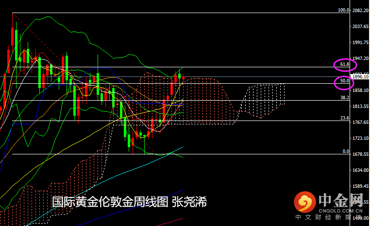技术上;周线级别:金价近两周有所遇阻上轨线附近阻力,多头也有所减弱,不过目前还好运行在5周线以及云层之上,暗示多头仍有机会再度走高,近期上方依然关注布林带上轨附近阻力,下方线关注5周均线初步支撑,进一步则关注10周线均线支撑,较长期看,金价自2019年初一直保持在100周均线上方运行,故此如有跌破10周线支撑,那么在临近100周均线附近也不视为再度中长期看涨机会,这也是我在今年3月底1676美元附近给出较大看涨观点的依据。