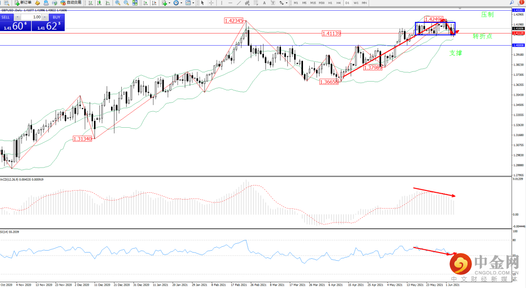 多头动力延续布林带指标通道中上轨区间持续震荡上扬,高位呈矩形震荡后抵达1.42496附近开始缓慢回撤,纠结于布林带指标通道内维持宽幅整理中,布林带指标呈收口走势持续中,上方压制关注1.43283附近节点,低位支撑关注1.40008附近节点,关注布林带指标中轨下方1.41139附近转折点,MACD指标处于多头区域高位维持整理弱势向下移动中,RSI指标处于多头区域高位整理缓慢回撤至50均衡线附近节点后有回升迹象,如图: