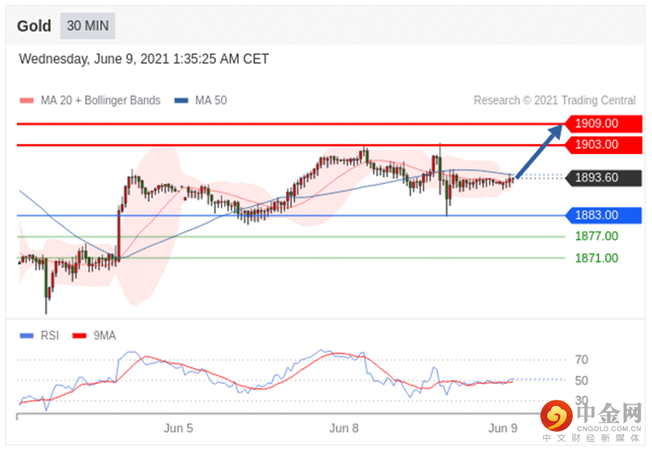 在1883.00之上,看涨。