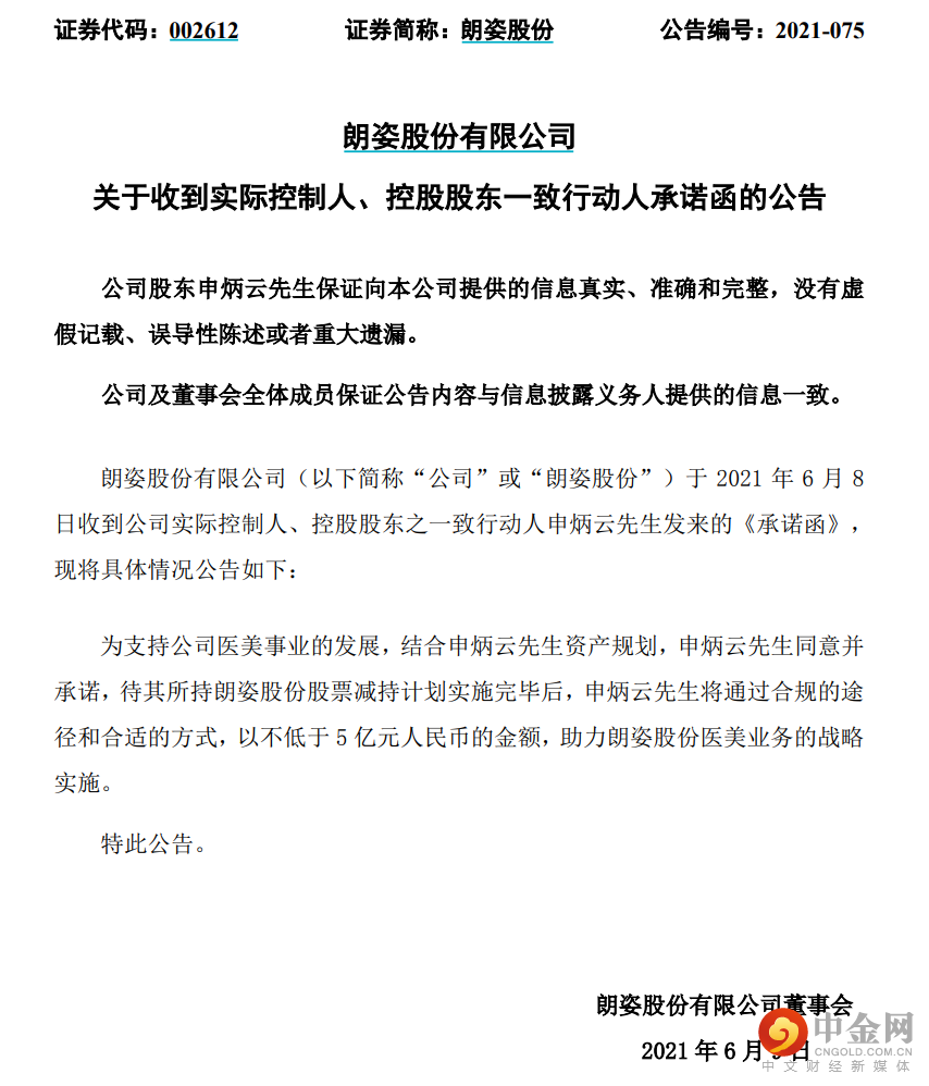 公告显示,实控人父亲申炳云在《承诺函》中承诺:待其所持朗姿股份股票减持计划实施完毕后,将通过合规的途径和合适的方式,以不低于5亿元人民币的金额,助力朗姿股份医美业务的战略实施。