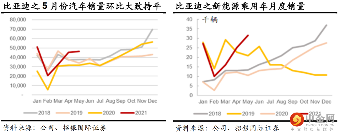 比亚迪5月份新能源汽车销量环比增长27.8%。比亚迪(1211 HK / 002594 CH, 买入, 目标价:282港元 / 275.6元人民币)公布5月份汽车总销量46,295辆,环比升2.3%,其中新能源汽车销量环比增长27.8%至32,800辆,占总销量之70.8%。我们认为,比亚迪之5月销量符合我们预期,新能源汽车销量增速领先特斯拉和其他新能源汽车新势力,我们预期比亚迪6月份新能源汽车销量增速维持强劲,受DM-I系列和插电式混合动力车推动。新能源汽车板块之气氛由5月中起改善,我们认为汽车销量增长将是继续推升估值之主要动力,因此相信比亚迪和理想汽车(LI US, 买入, 目标价:37.73美元)短期内有望跑赢同业。