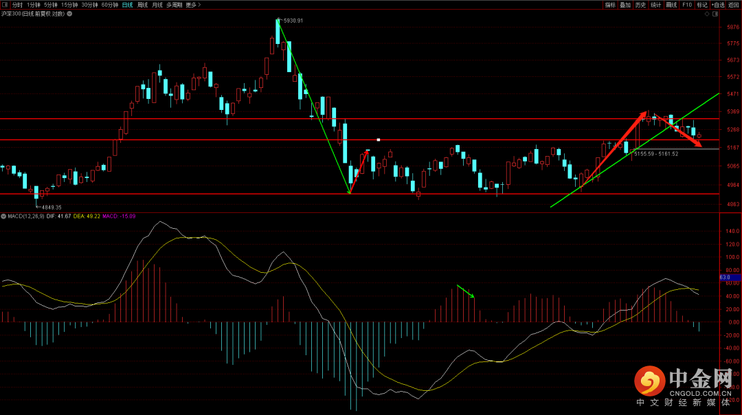 沪深300在前期平台上沿遇到支撑,短期如果出现跌破则下方缺口就可能出现回补的走势,而从macd的量柱可以看出这段下跌的动能并没有十分强势,短期需要注意是否出现日线底分型,一旦出现短期就可能出现止跌企稳向上的走势。