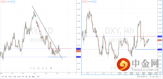 美元指数天图:目前行情继续在关键位置附近承压徘徊中,上方水平压制带在90.223附近,下方水平支撑带在89.536附近。由于市场动能不足,促使行情继续横盘整理,从日内4小时级别,价格在短期支撑带附近反弹至上方压制区域附近。可适当关注价格在此区间附近的表现,如果突破上行,后期可继续关注多头机会。反之,则继续承压调整。