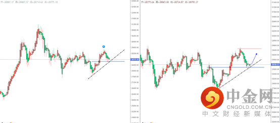 恒生指数天图:目前趋势继续在回测上升趋势线与水平支撑带28646.35附近。虽然整体趋势处于偏多阶段,但由于上方水平压制较重,需要等待进一步调整。从日内4小时级别,价格正处于在关键位置附近徘徊。可关注此区间附近的表现,如果测试起稳则继续保持多头方向。反之,则可能转势下行。