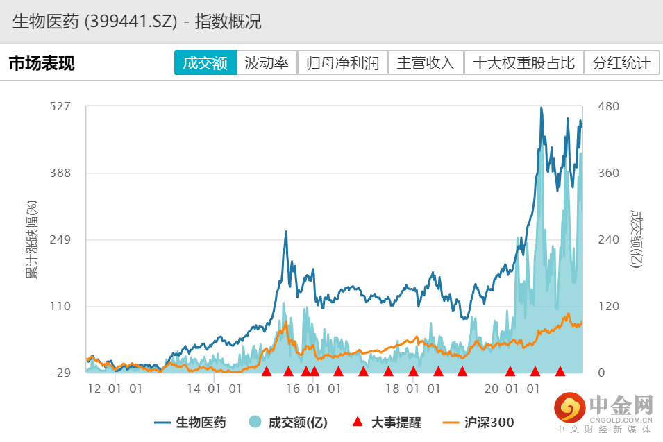 指数表现:自2011-06-03指数基日,截至2021-05-27,国证生物医药指数涨幅达599.91%,对比同期沪深300指数涨幅仅为132.21%