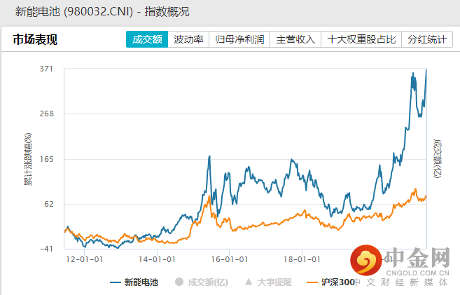 指数表现:自2010-01-01以来,截至2021-04-30,新能电池指数累计涨幅达343.23%,对比同期沪深300指数仅上涨47.73%