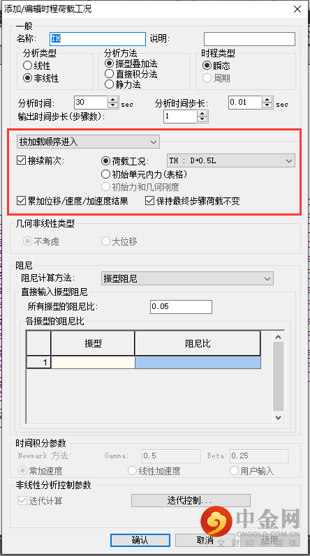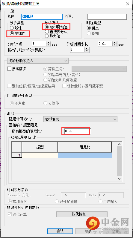 分析方法必须选择非线性振型叠加,否则无法作为后续隔震分析的初始状态,阻尼比取0.99是尽量让结构自重加上去不引起动力放大作用,忽略动力部分。