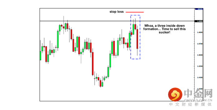 两根蜡烛后,您会发现一个漂亮的三内向下烛台模式,这被认为是一个非常有效的看跌信号。