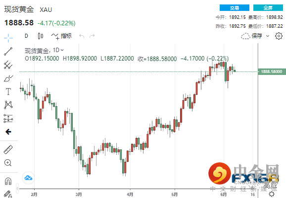现货黄金收报1888.58美元/盎司,下跌4.17美元或0.22%,盘中一度触及1898.92美元/盎司高点,但随后冲高回落并刷新日低至1887.22美元/盎司。
