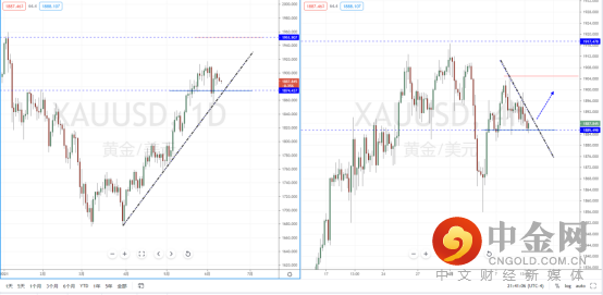黄金天图:目前行情继续在高位区间徘徊调整,下方有上升趋势线的支撑作用,短期水平支撑带在1874.437附近。从日内4小时级别,价格在测试水平支撑带1885.498附近止跌。但上方依然有下降趋势线的压制作用,可适当关注价格调整后上行突破的多头机会,上方目标位置参考1896.587附近。