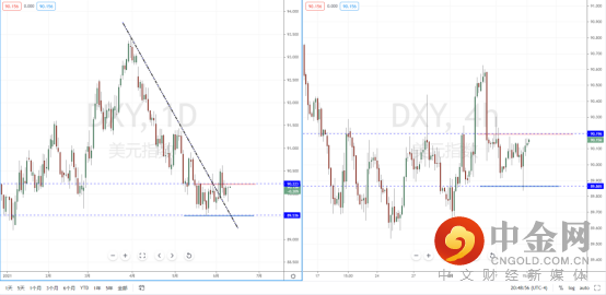 美元指数天图:短期趋势在历经低位区域徘徊后,再次极端测试下方水平支撑带89.849附近后向上反弹,并且正冲击上方水平压制带90.223附近。从日内4小时级别,价格在区间内测试支撑后上行,可适当关注价格在压制区域的表现,如果继续突破上行将可能打开多头空间,反之,则继续受阻调整。