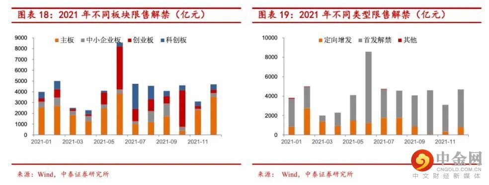 中泰证券研报称,2021年限售规模在5.2万亿,解禁高峰在2/6/7月,解禁规模都在4000亿以上。分板块来看,主板的解禁高峰在1月、6月、11月,解禁规模超过2000亿;中小企业板解禁高峰在8月、9月,解禁规模超过1000亿;创业板解禁高峰在6月、10月,解禁规模超过2000亿,科创板的解禁高峰在7~8月,解禁规模均超过1000亿。