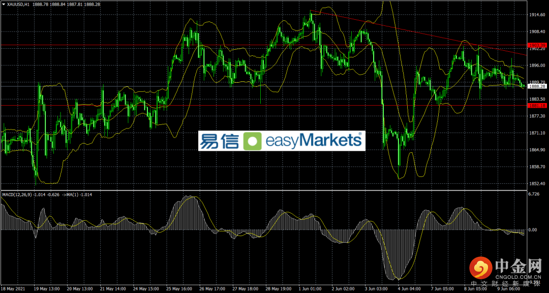 昨日非美货币走势先涨后跌,开始市场风险偏好情绪升温,非美一路走高在触及上方关键压力位置后多头获利了结,似乎在美国公布5月CPI数据前,市场倾向于谨慎交易,缩减仓位。美股三大指数也出现回落,道指盘中下跌130点左右。黄金在挑战1900美元未果后回落,目前在1888美元附近徘徊。