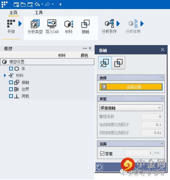 通常来说,创建接触包含以下步骤:选择需要创建接触的对象-->选择接触类型-->设置接触容差-->创建接触