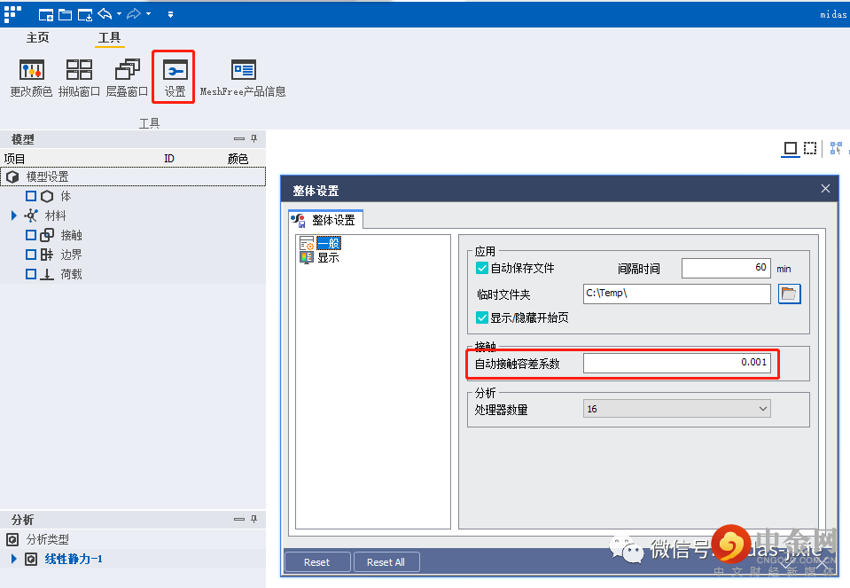 自动接触容差系数通过设置对话框中来进行设定,初始默认值是0.001。