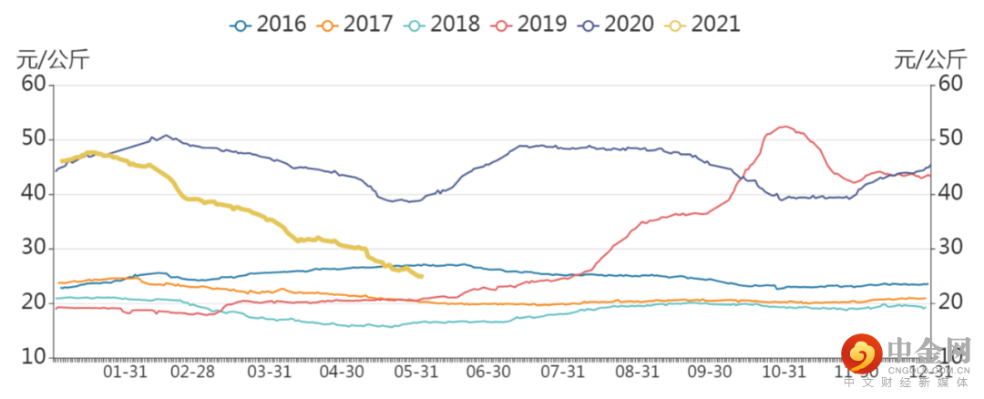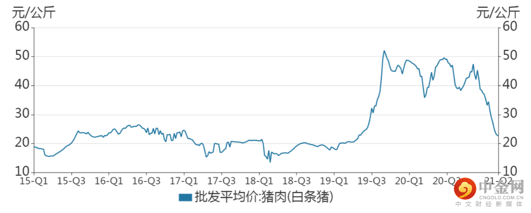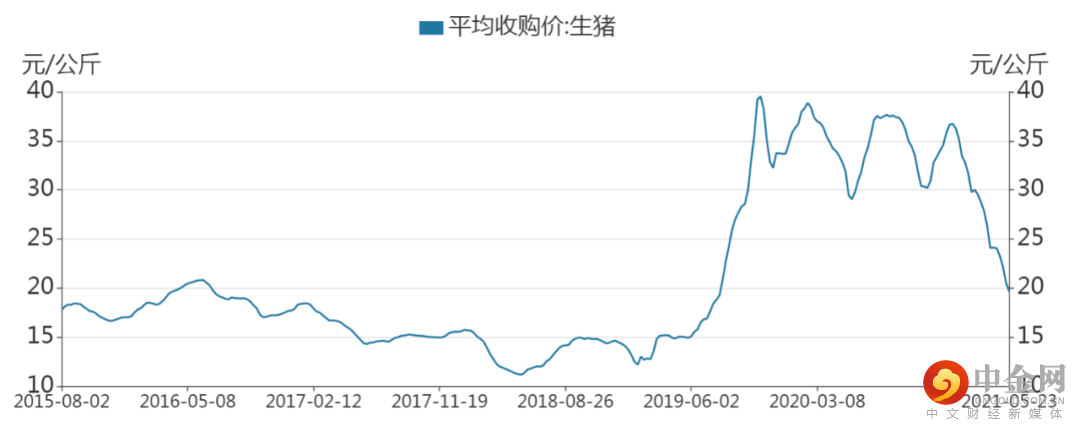 第四轮猪周期,从2018年6月至今,2017年猪价持续走弱,2018年上半年的大幅亏损导致行业开始逐步淘汰母猪,2018年7月非洲猪瘟的爆发致能繁母猪存栏快速下降。2019年猪价开启了快速上涨通道,疫情由北往南传播、防控压力加大及种猪缺乏致产能恢复非常缓慢,猪肉供给缺口不断拉大,猪价不断刷新历史新高,2019年11月达到41元/千克。2020年受新冠疫情对猪肉消费的影响,猪价提前进入周期下行阶段,猪价更多表现为台阶式下降。截止2021年6月4日,猪肉(白条猪)批发平均价为22.96元/公斤,此时猪肉(白条猪)批发平均价已经接近前3轮猪周期高点的价格,2季度季节性淡季,短期内猪价仍存下跌动能。