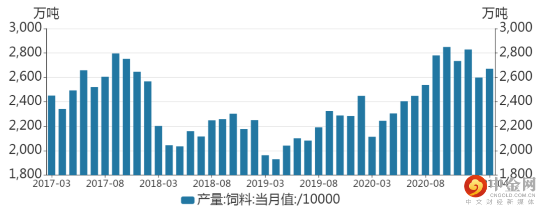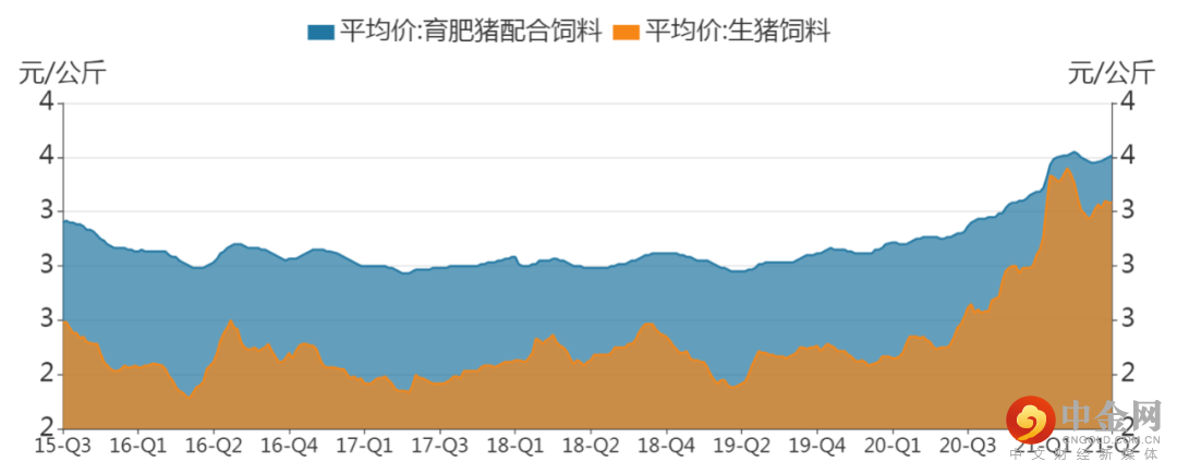 2020年9月份至今饲料产量快速上升到达近5年高点区域,可见养殖恢复情况理想,且当时饲料采购成本相对2021年较低。2021年一季度饲料平均价快速上涨,已超过近6年高点。
