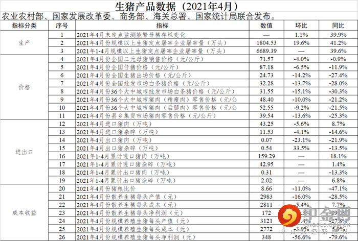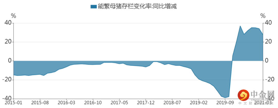根据农业农村部发布的最新数据,4月份全国能繁母猪存栏量环比增长幅度是1.1%,连续19个月增长,比去年同期增长了23%。那按现在这个能繁母猪存栏量的水平,已经相当于2017年年末水平的97.6%。