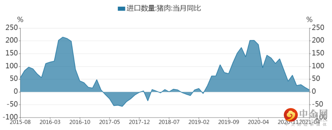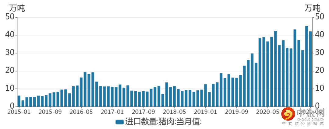 伴随着2019年猪肉价格的持续走高,中国肉类进口量也是逐月提高,2021年至今也是保持在高位。