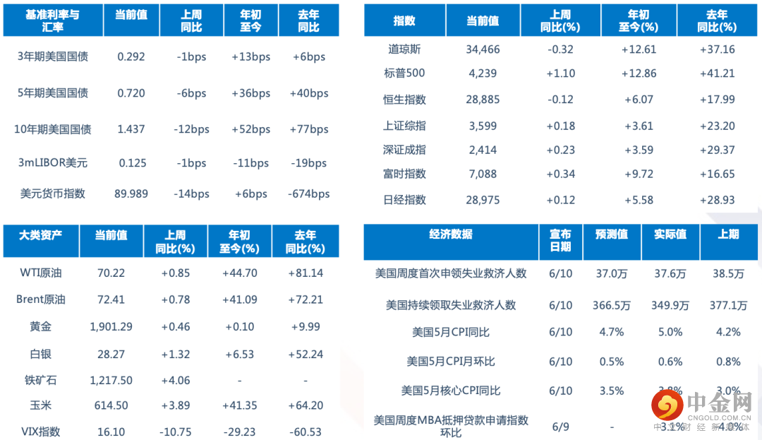 利率汇率:尽管最新公布的美国5月通胀数据再度超预期上涨,但美债并无较大反应,全周收涨。在美国通胀数据公布后,10年期美债收益率短线跃升,一度重上1.53%刷新日高,随即回落。除美债以外,欧洲债市过去一周也维持涨势。这显示市场对美国通胀预期已经见顶,投资者对长期通胀预期有所降温,以及认为美联储不会快速转向紧缩的预期。