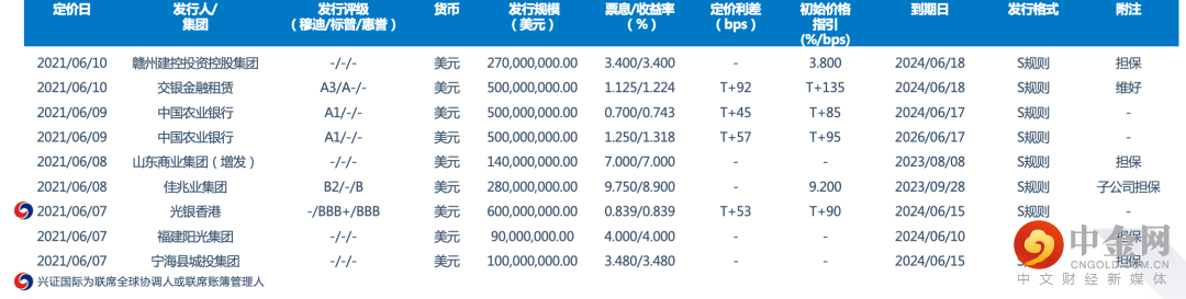 本周新发:本周中资美元债一级市场发行数量及规模较上一周均有所下降,主要为金融行业发行人。本周中国农业银行发行双年期美元债券,每个年期募集金额均为5亿美元,是全周发行量最大的一笔交易。中国光大银行也成功发行3年期6亿美元债券,刷新其自身于今年3月发行美元债时创下的价格新低。