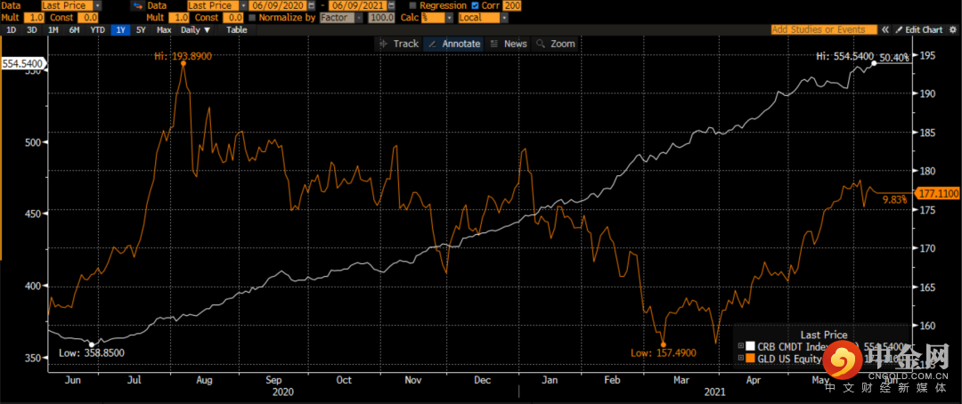 白色的CRB指数与橙色的SPDR黄金股(GLD)对比,时间长度为1年。