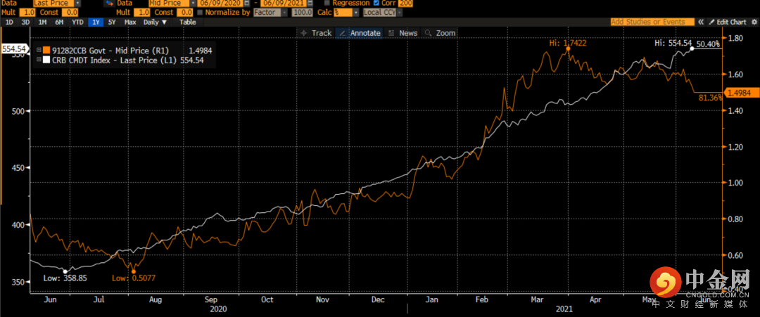 白色的CRB指数与橙色的10年期美国国债收益率比较,时间长度为1年。
